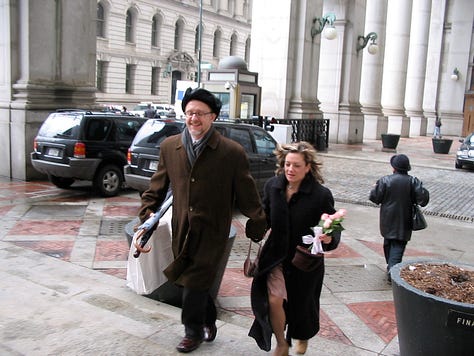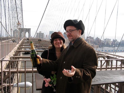 …Not knowing that two months later, we would meet by chance, fall in love, and make a life together. That in 2005 we’d marry—at the marriage bureau in the Municipal Building at 1 Centre Street—then make a champagne toast in the middle of the Brooklyn Bridge.